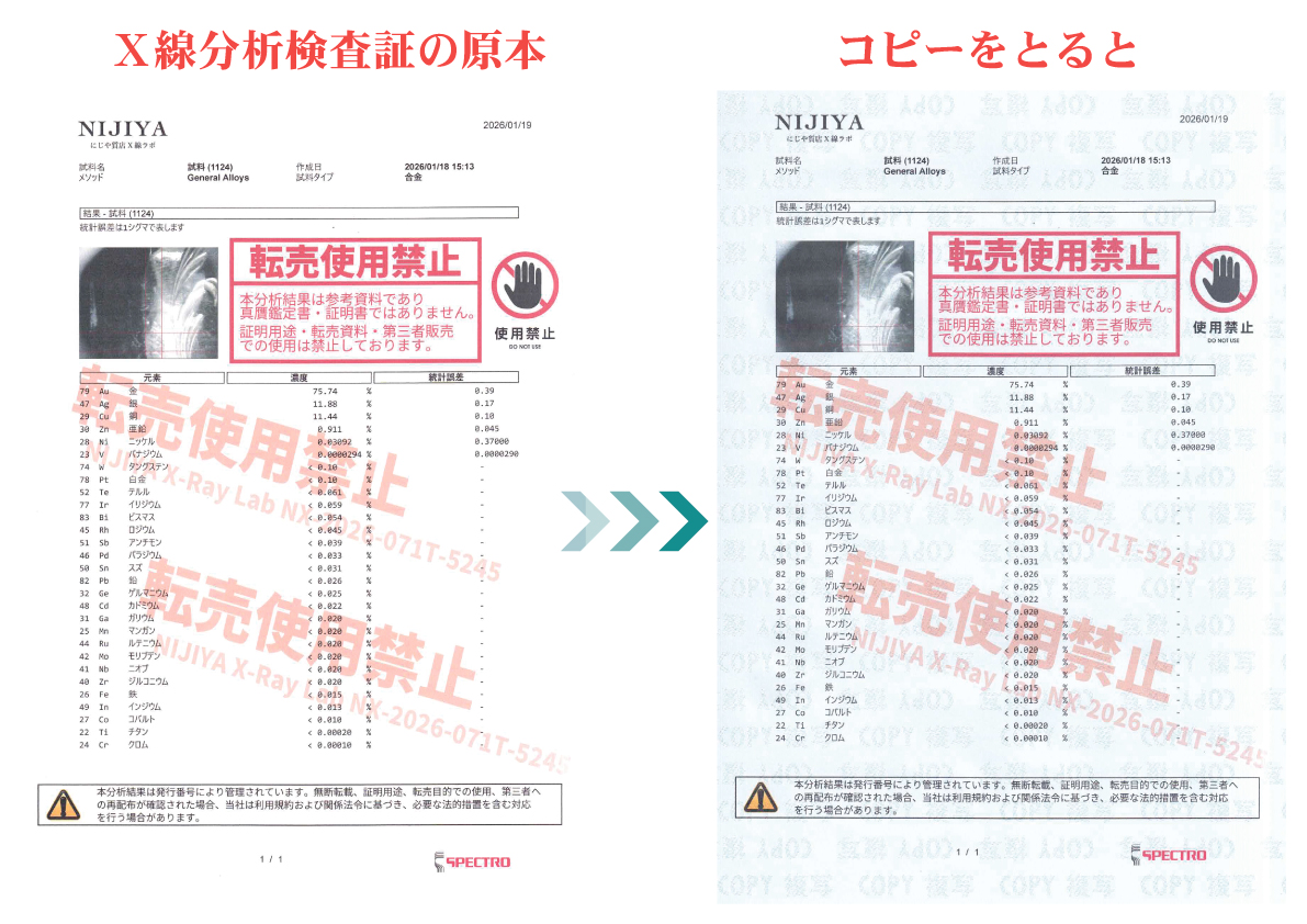 🔒 にじや質店X線ラボの分析結果は「転売使用禁止」および「偽造防止専用用紙」でお届けします