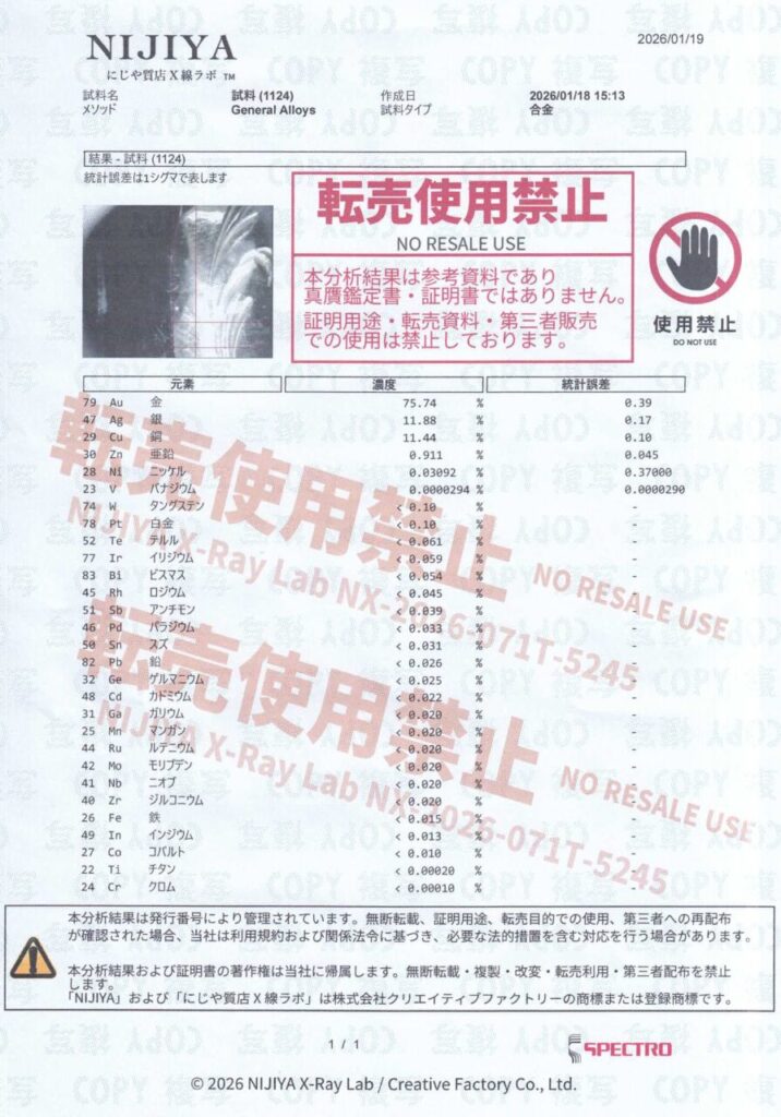 にじや質店X線ラボの分析結果シートおよびX線分析報告書は、参考資料・個人利用を目的としたものであり、転売資料、出品画像への掲載、第三者への再配布、営業資料への流用は禁止しております。
