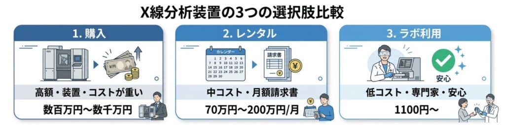 この記事では、「X線分析装置の購入・レンタル・ラボ利用」それぞれの本当の違いと、最も合理的な選び方を分かりやすく解説します。