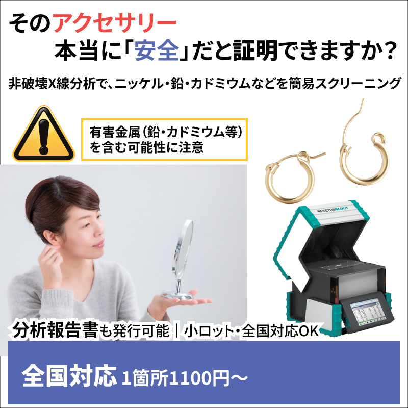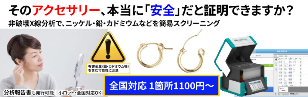 販売・流通するアクセサリーに、アレルゲン金属(Ni・Cr・Coなど)が含まれているかどうかを数値で確認可能です。