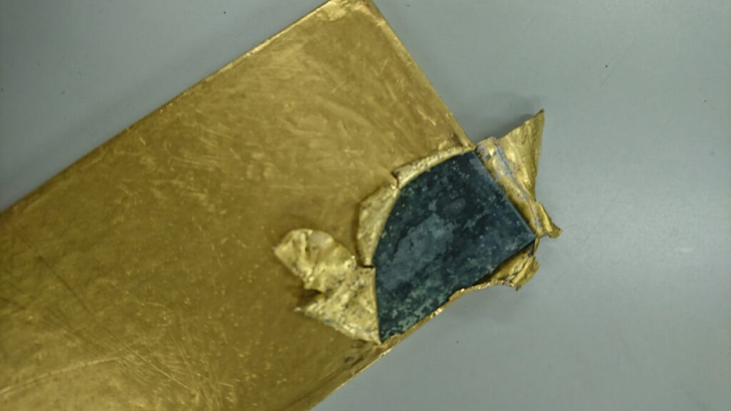 これにより、表層のみを偽装したインゴットや、内部に異素材を含むリスクを知ることができ、分析報告書を発行いたします。
