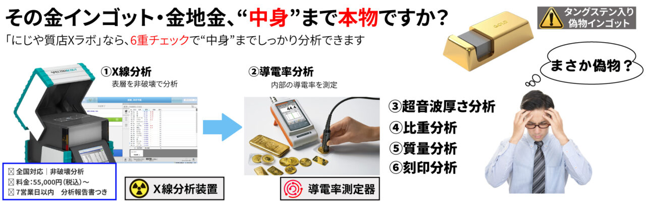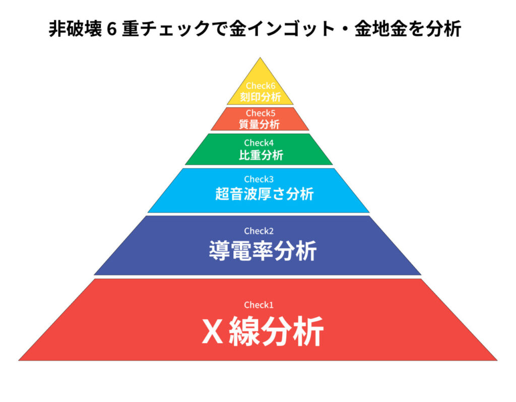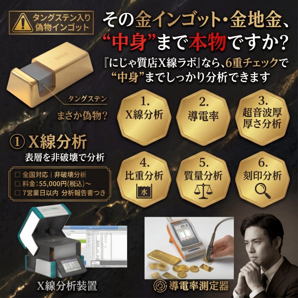 にじや質店X線ラボでは、金インゴット・金地金の確認において、単一の検査結果に依存しない「非破壊・6重チェック体制」を採用しています。